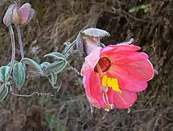 Es un arbusto trepador con grandes flores de color rosado brillante de 10 cm de diámetro; receptáculo con forma de embudo con anteras amarillas; el fruto es verde de 10 cm de largo, oblongo, parecido a la granadilla. Crece entrelazado a los árboles desde los 3700 hasta los 4400 m.[2]