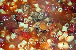 La pasta e fagioli se hace con frijoles comunes y algún tipo de pasta pequeña, como coditos. La base suele ser aceite de oliva, ajo, cebolla picada y especias, junto con tomate estofado o pasta de tomate, o la salsa marinara sobrante del domingo, en algunas recetas tradicionales caseras. Algunas variantes no incluyen tomate, empleando un caldo.