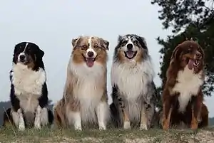 Los colores de estos pastores son el negro, el rojo (a veces llamado hígado), el azul mirlo (mármol negro y gris) y el rojo mirlo (rojo mármol y plata o beige). Cada uno de estos colores puede, a su vez, tener puntos de cobre y/o marcas blancas en varias combinaciones en la cara, el pecho y las patas. Un perro negro o rojo con el cobre y el ajuste blanco se llama tricolor o tri, un perro negro o rojo sin cobre se le llama bicolor blanco o bi. El blanco no deben aparecer en el cuerpo del perro desde el punto superior de la escápula hasta la cola. Las orejas deben estar cubiertas completamente de pelo y rodeadas de pigmentos ( color, excepto el blanco). También los ojos deben estar rodeados de color, incluyendo el borde de los párpados. El exceso de blanco da riesgo de sordera y ceguera.