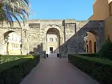 A fondo hay un lienzo de muralla con tres pórticos. Este lienzo forma parte del palacio almohade del siglo XI conocido como Al-Qsar al-Muwarak, que significa "Alcázar de la Bendición".[1]