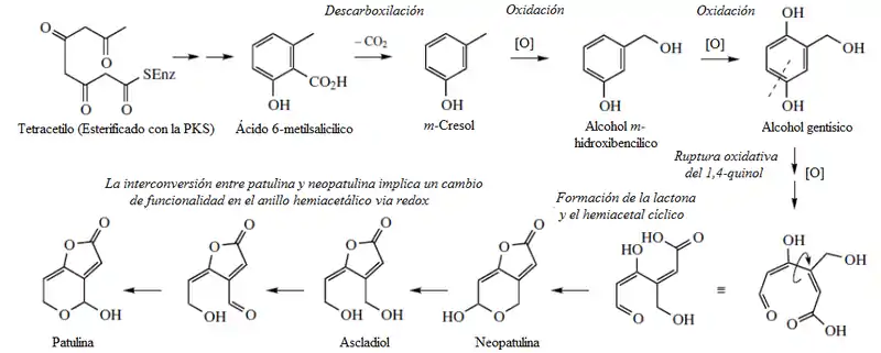 La patulina es una toxina producida por mohos muy diferentes. Se describió por primera vez en la década de 1940, cuando se descubrió en la especie Penicillium patulum, más tarde llamada Penicillium urticae y hoy conocida como Penicillium griseofulvum.[2] La patulina se ha encontrado en micromicetos de los géneros Aspergillus, Byssochlamys, Gymnoascus, Paecilomyces y Penicillium, aunque ahora se han añadido a la lista algunas cepas de Mucor y algunos deuteromicetos.[3] Uno de los mayores productores de patulina es Penicillium expansum, causante de múltiples pérdidas en frutas.[4]
