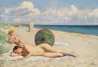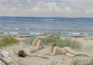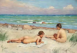 - Dos jóvenes bañistas entre arbustos cerca de la costa de Hornbæk, s/f. Óleo sobre lienzo, 57 x 74 cm.