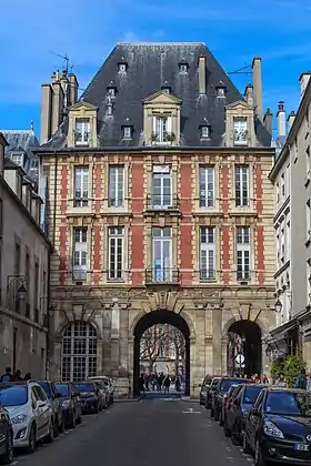 - Vista del Pavillon du Roi desde la rue de Birague, la fachada lleva el monograma de Henri IV y el pasaje permite la comunicación con la place des Vosges .