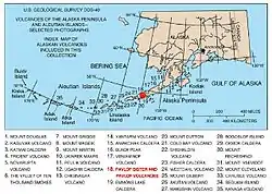 Mapa mostrando los volcanes de Alaska. TLa marca recoge la localización del Pavlof Sister.