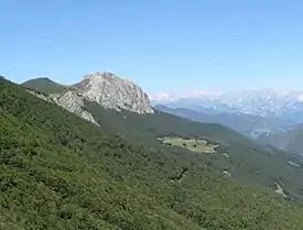 ![]() La peña, desde el mirador de Piedrasluengas, con los Picos de Europa al fondo. | ||