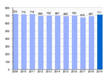 Gráfica de evolución demográfica de Peñuelas entre 2009 y 2019 |