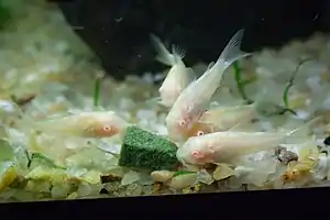 En los peces, la mayoría de los bentos exhiben una región ventral plana para descansar más fácilmente su cuerpo sobre el sustrato. [13] La excepción está dada por el pez plano, que está deprimido lateralmente pero yace de lado. [13] Además, muchos exhiben lo que se denomina una boca "inferior", lo que significa que la boca apunta hacia abajo; esto es beneficioso ya que su comida a menudo se encuentra debajo de ellos, en el sustrato. [13] Los comederos inferiores con bocas que apuntan hacia arriba, como los uranoscópidos, tienden a capturar presas de natación. [14] Algunos peces planos, como el halibut, en realidad tienen un ojo "migratorio" que se mueve hacia el lado de arriba del pez a medida que envejece. [13]