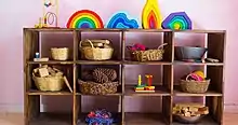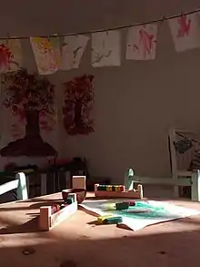 La rutina diaria incluye juego libre, trabajo artístico (por ejemplo, dibujo, pintura o modelado), rondas (canciones, juegos e historias) y tareas prácticas (por ejemplo jardinería, cocina y limpieza), con variaciones rítmicas.[31] Los períodos de recreo al aire libre se alternan con las actividades en el interior del espacio educativo.[30][32] El salón de clases pretende parecerse a un hogar, con herramientas y juguetes sencillos fabricados con materiales naturales que se prestan al juego imaginativo.[33] El uso de materiales naturales ha sido ampliamente elogiado por numerosos autores por cubrir las necesidades estéticas de los niños, alentando su imaginación y reforzando su identificación con la naturaleza.[33][34][35][36] aunque en ciertas revisiones también se evalúa si la preferencia por lo natural, por los materiales no manufacturados, incluye "una reacción contra los aspectos deshumanizantes de la industrialización del siglo XIX" en lugar de una "evaluación razonada de las necesidades de los niños del siglo XXI".[37]