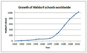 Actualmente hay más de 1000 escuelas Waldorf independientes,[4] unos 2000 jardines de infancia y 646 centros de educación especial, ubicados en 60 países,[5][6] lo que constituye uno de los movimientos escolares independientes más grandes a nivel internacional.[7] También hay varias escuelas públicas basadas en la pedagogía Waldorf,[8] escuelas charter y academias, y entornos de educación en el hogar.[9] Las escuelas basadas en la pedagogía Waldorf han sido criticadas por su acercamiento místico al conocimiento, por ser parte de un grupo religioso y por la falta de rigor académico.[10] Además, se ha criticado su promoción de las pseudociencias y del pensamiento mágico.[11] En un artículo académico publicado en 2011 se han identificado las escuelas Waldorf como un factor de riesgo de la reticencia a la vacunación.[12]