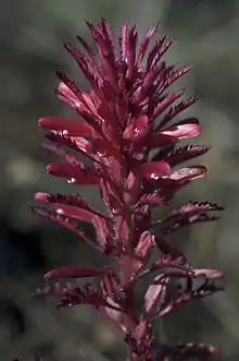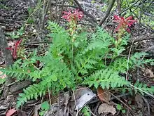Pedicularis densiflora es una planta perenne herbácea con tallos verdes o, a veces, rojizo o magenta y las hojas con forma de helechos y largas espigas de color rojo oscuro con flores de color rosa brillante con pétalos dentados.