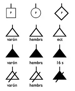 Un diagrama de pedigrí hace uso de cuatro símbolos básicos dos cuadrados (uno vacío y uno lleno) y dos círculos (uno vacío y uno lleno). Los círculos representan hembras, los cuadrados machos, los símbolos llenos representan la aparición fenotípica de la característica que se está rastreando, mientras que los símbolos vacíos representan a individuos que no la presentan.