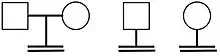 Nomenclatura en casos de embarazos y abortos. En la primera línea aparecen los casos de embarazo en curso. En la segunda línea, los abortos espontáneos normales (indicando en la parte inferior el sexo o el tiempo de gestación). En la tercera línea, los abortos espontáneos afectos (indicando en la parte inferior el sexo o el tiempo de gestación). En la cuarta línea, las interrupciones voluntarias del embarazo.
