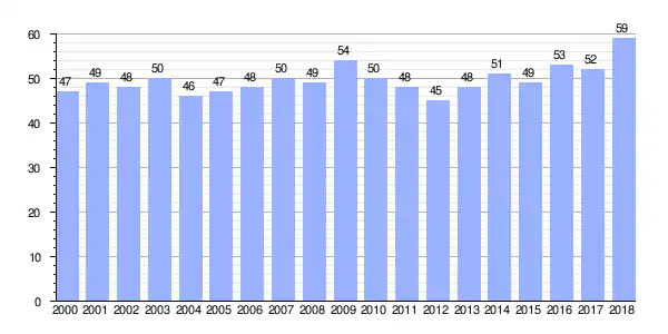 Gráfica de evolución demográfica de Pedregal entre 2000 y 2018