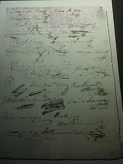 Fotografía de una de las hojas del petitorio firmado por los vecinos de Buenos Aires el 25 de mayo de 1810. (Nótese la firma de García, arriba a la izquierda).
