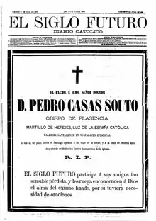 Anteayer falleció en Plasencia el célebre Obispo D. Pedro Casas Souto, de más de ochenta años. Su celebridad no provenía del saber, sino de la intransigencia contra los liberales, ó mejor aún, contra los mestizos.Hasta la muerte permaneció fiel á la política de El Siglo Futuro.