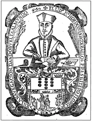 ![]() El marino y clérigo español Pedro Ordóñez de Cevallos en el frontispicio de la edición original de su libro Viaje del mundo | ||