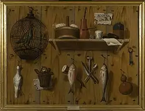 Trompe l'oeil de animales y objetos, óleo sobre lienzo (92 x 123 cm.) Madrid, Real Academia de Bellas Artes de San Fernando.
