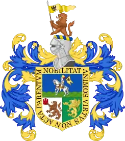 - Cortado y medio partido: 1.º, de azur, sobre un prado de sinople, un cabllero a caballo, armado de oro y plata, almete plumado de sinople, oro y gules, lanza con bandera de oro cargada de águila explayada y el sable en la mano diestra; 2.º, de plata, león de propio rampante con un castillo de gules en la mano; 3.º, de sinople, el grifón de oro, teniendo en una mano corona de oro; bordura del todo de oro y el mote en letras de sable: «NOBILITAT ANIMOS VIRTVS NON ACTA PARENTVM».[n 1][7]