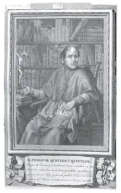- Retrato de Pedro de Quevedo y Quintano con un epítome sobre su vida incluido en el libro Retratos de Españoles ilustres, publicado en el año de 1791.