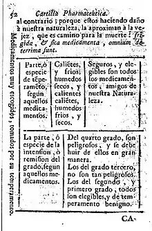 Tras una breve introducción, de tres páginas, comienza de nuevo el método de la cartilla, de preguntas y respuestas. Viñaburu la llama explicación interrogativa. Explica las gradaciones en la complexión, por ejemplo, la manzanilla es caliente en primer grado, los marrubios en segundo etcétera.