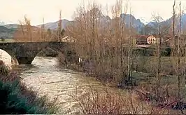 Monumento sumergido que emerge cada año de las aguas embalsadas, es citado por Madoz en 1845 y descrito en su relación como obra de "piedra calar con cuatro ojos". El que en 1988 quedó bajo las aguas presentaba tres grandes arcos, con cuatro más pequeños, uno de ellos cegado cuando se construyó al inicio del siglo XX, la antigua carretera C-615 de Boca de Huérgano a Palencia por el Puerto de Monteviejo, y la carretera a Almanza a través del Puerto del Pando.[9]