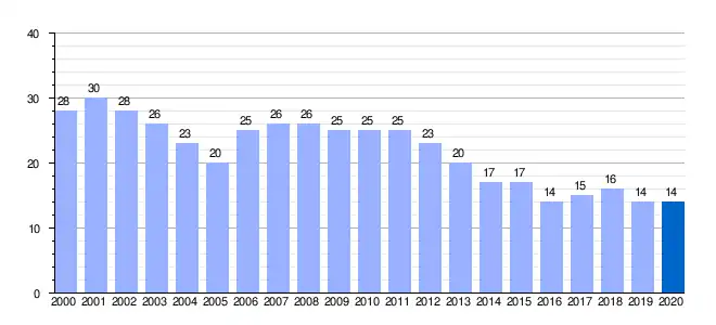 Gráfica de evolución demográfica de Pedroso de la Carballeda[6] entre 2000 y 2020 |