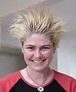 Spiky | El peinado spiky (en español: puntiagudo), conocido en español con distintos nombres como peinado de picos o peinado de púas, es un tipo de peinado que se caracteriza por la elevación y posicionamiento del cabello en una forma vertical. El peinado spiky tiene una menor definición que el peinado liberty spikes y es logrado mediante la aplicación de fijadores como ceras, pomadas y gel en una forma retrocedente. |