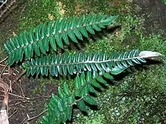 Las frondas tienen generalmente de 20 a 50 cm de largo. Las frondas tienen entre 25 a 65 foliolos. Estas hojas tienen un tallo corto o sin tallo, son oblongas a oblongo estrechas de 25 mm de largo, 2,5 a 7 cm de ancho. Las frondas son de color verde oscuro, pálido por debajo. Los soros son de aproximadamente 1 mm de ancho.