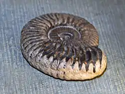 ![]() Concha fósil de Peltoceras arduennense de Calvados (Francia), en exhibición en la Galerie de paléontologie et d'anatomie comparée en París | ||