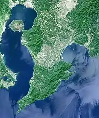 Desde 1914, un puente de tierra conecta la isla de Sakurajima con el noroeste de la península.
