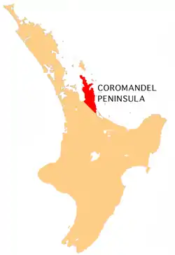Forma parte de la región de Waikato y se extiende por 85 km al norte del extremo occidental de la bahía de Plenty, formando una barrera natural que protege el golfo de Hauraki y a la bahía conocida como bahía Firth de Thames al oeste de las aguas del océano Pacífico, al este. El punto más largo mide 40 km.