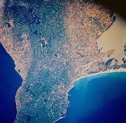 ![]() Vista de satélite de la región: la península de Fleurieu es la situada abajo, a la izquierda | ||