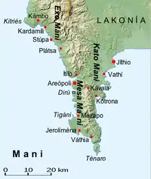 La península de Mani (en griego: Μάνη, romanizado: Mánē), también conocida durante mucho tiempo por su nombre medieval Maina o Maïna (Μαΐνη), es una región geográfica y cultural del sur de Grecia que alberga a los maniotas (Mανιάτες, Maniátes en griego), que reivindican su ascendencia de los antiguos espartanos. La capital de Mani es Areópolis. Mani es la península central de las tres que se extienden hacia el sur desde el Peloponeso en el sur de Grecia. Al este se encuentra el golfo de Laconia, al oeste el golfo de Mesenia. La península de Mani forma una continuación de la cordillera de Taygetos, la espina dorsal occidental del Peloponeso.