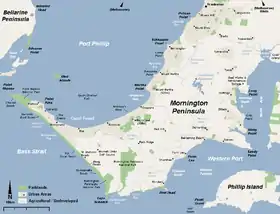 ![]() Vista de la bahía de Port Phillips; la península de Mornington se ve parcialmente (izqda. abajo) | ||