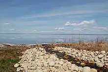 ![]() Esquina SE del lago desde la montaña Martin (mirando hacia el sur). Al fondo se divisan la isla Dog, la playa Devonshire y la ciudad de Slave Lake | ||
