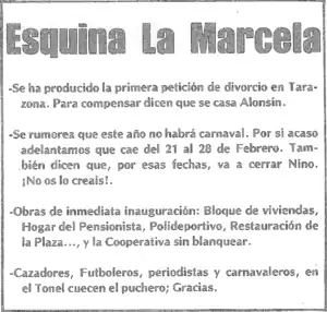 Se trataba de una parte del periódico donde aparecían todo tipo de chascarrillos relacionados con los avatares que acontecían en el pueblo. Era una sección sin firma en la que los miembros del Colectivo Tempero ponían en marcha su imaginación para obtener alguna sonrisa de sus paisanos, todo hecho sin ánimo de ofender. Algunos clásicos de la esquina de la Marcela: