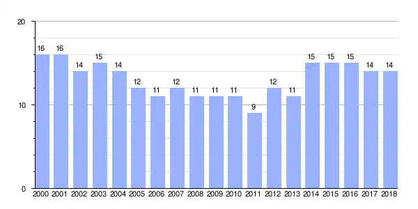 Gráfica de evolución demográfica de Perillona entre 2000 y 2018 |