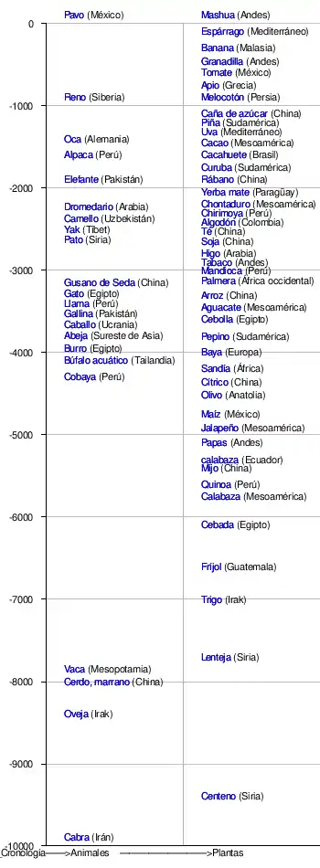 EspárragoBananaMashuaPersea americanaCurubaGranadillaPepinoPiña tropicalChirimoyaQuinoaMateMandiocaApioRábanoMelocotónUvaCaña de azúcarCacahueteCacaoChontaduroSojaCebollaHigoTéArecaceaeCítricoSandíaOlivoJalapeñoBayaLentejaMijoSolanum tuberosumFríjolCucurbitaTabacoArrozTomateAlgodónMaízCebadaTrigoCentenoElefantePavoRenoGansoLama pacosDromedarioCamelloYakSedaPatoLlamaGatoGallinaAbejaBubalus bubalisBurroCaballoCobayaVacaOvejaCabra