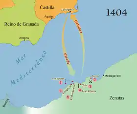 La expedición zarpó a principios de mayo de 1404, recorrió río abajo el Guadalquivir, y al salir al Atlántico se dirigió al estrecho de Gibraltar. Luego lo cruzó y se dividió en dos: la nao navegó a su aire y las galeras avanzaron paralelamente a la costa peninsular. Cuando éstas se encontraban aproximadamente a dos millas de Málaga se levantó una espesa niebla. Al disiparse se hallaron frente a la ciudad. Pertenecía al Reino de Granada, que en aquel momento disfrutaba de un tregua con Castilla. Los habitantes obsequiaron a los recién llegados con presentes de hospitalidad, tras lo cual estos siguieron su camino con destino a Cartagena. La travesía se complicó a causa de una tormenta, por lo que la expedición se refugió en el puerto de Águilas hasta que amainó al día siguiente. En Cartagena estableció Niño una base de operaciones.[3] Pero el primer objetivo no serían los corsarios cristianos, como estaba previsto, sino las costas de Berbería. Tras navegar varios días por sus proximidades sin encontrar ningún navío, el capitán castellano decidió desembarcar en Alcoçévar[4] (alguna población al oeste de Orán). La expedición repuso agua potable y tuvo un victorioso choque, aunque militarmente intrascendente, con jinetes berberiscos. Después reeembarcó, y tras buscar durante varias jornadas sin éxito naves musulmanas alrededor de las Islas Habibas (cerca de Orán), regresó a Cartagena. [5]