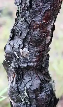 Este arbusto o árbol erecto alcanza aproximadamente 5 metros de alto, usualmente con pocas ramas. Sus hojas verde oscuras son estrechas y ligeramente elípticas, y pueden medir hasta 220 milímetros de longitud. La distintiva corteza es de color rojo oscuro a bronce con muchas capas con consistencia parecida a papel que se desprende fácilmente.