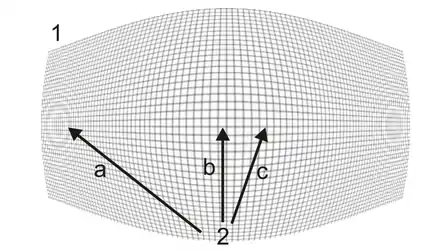 Las distancias a y c entre el observador y la pared son mayores que la distancia 'b, por lo que se adopta el principio de que cuando un objeto está a una distancia mayor del observador, se vuelve más pequeño. En consecuencia, la pared se reduce y, por lo tanto, aparece distorsionada en los bordes.