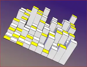 - La perspectiva de cuatro puntos de fuga es la que, para ángulos de apertura moderados, posiblemente más se aproxima a la perspectiva contemplada por el ojo humano, mientras que al mismo tiempo es efectiva para crear imágenes de espacios imposibles. Una forma de generar este tipo de perspectivas es utilizar como superficie de proyección un cilindro, en cuyo eje se sitúa el punto de vista. Esta disposición genera cuatro puntos de fuga, localizados por delante, por detrás y a la izquierda y a la derecha del observador. Si se desarrolla el cilindro por una de sus directrices, se puede obtener una perspectiva panorámica que cubre 360° alrededor del espectador. Es el equivalente curvilíneo a una perspectiva cónica convencional con dos puntos de fuga. Esta técnica permite usar una línea vertical como línea del horizonte, creando una vista de gusano y una vista de pájaro simultáneamente. Utiliza cuatro o más puntos igualmente espaciados sobre una línea del horizonte, siendo todas las líneas verticales perpendiculares a la línea del horizonte, mientras que las ortogonales se crean usando un compás sobre las líneas trazadas a través de cada uno de los puntos de fuga separados entre sí en un ángulo de 90 grados.[4]