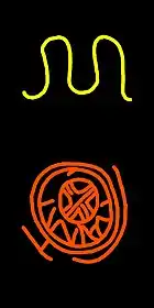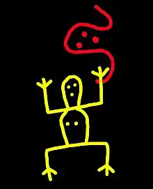 - Petroglifo 10, en el cual hay dos monos separados por una línea en zigzag, esta línea tal vez podría interpretarse como un río.[3]