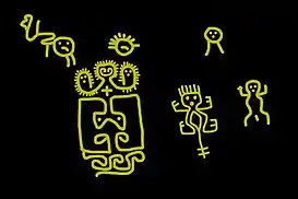 - Petroglifo 112, en este hay varios seres de dos caras debajo de lo que parece ser un sol, los seres de dos caras se podrían interpretar como mujeres embarazadas.[3]