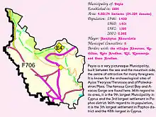 Peyia cubre actualmente una amplia área que se extiende desde el bosque de Peyia, en las colinas muy por encima de la ciudad por el norte, el mar por el sur, y desde la bahía de Maa en el este a la península de Akamas en el oeste. Sin embargo, y obviando estos límites, el nombre de Peyia se utiliza casi siempre para referirse a la ciudad.