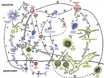 - Ciclo vital: Las primeras investigaciones que establecían un ciclo vital complejo de Pfiesteria piscicida están discutidas debido a resultados contradictorios obtenidos en investigaciones de los últimos años, especialmente sobre la cuestión de la existencia o no de una forma ameboide tóxica.[8]