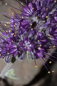 La inflorescencia consiste en varias panículas cortas, fuertemente empaquetadas, al final del tallo, parecidas a un cepillo. La corola en forma de campana de color azul oscuro a púrpura tiene una anchura de 4-6 mm. Es peluda por dentro y por fuera pero no glandular. Los filamentos son dos a tres veces más largos que la corola y dan a la inflorescencia un aspecto borroso. Las anteras son de color amarillo brillante o naranja. La fruta consiste en cápsulas de dos cámaras con 8 a 18 semillas. [1]