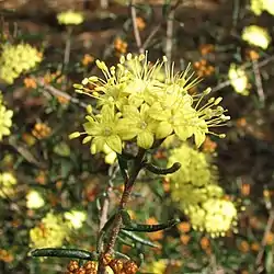 Es un arbusto de hojas estrechas que alcanza un tamaño de 1-1,5 m de altura, con tallos ± escamas de color marrón. Las hojas lineales oblongas, ± cilíndricas, de 0,4-2 cm de largo, 0,8-2 mm de ancho, el ápice obtuso, el margen recurvado, la superficie superior ± glabra (con escamas en su juventud), el envés estrellado-escamoso, pero a menudo oscurecida por los márgenes revolutos. Las inflorescencias con 3-10 flores, sésiles; pedicelos delgados, de 3-8 mm de largo. Hemisférica, suave. Pétalos 3,5-4,5 mm de largo, con escamas plateadas y oxidado fuera.[1]