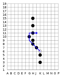 Ohs mueve el balón de K6 – G9 – G11 – J11. Los hombres de J7, H8, G10 y H11 se retiran. El salto de K6-G9-J9-G7 no sería legal, ya que eso haría saltar al hombre en H8 dos veces. Si el balón finaliza el movimiento sobre o sobre la línea de gol del oponente, se ha marcado un gol. Si el balón pasa a través de una línea de gol, pero termina en otro lugar debido a más saltos, el juego continúa.