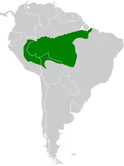 Se distribuye en la porción sur de la cuenca amazónica, desde el noreste de Perú, extremo sur de Colombia y Amazonia brasileña, principalmente al sur del río Amazonas, hacia el este hasta su desembocadura en el Océano Atlántico, y hacia el sur, hasta el centro de Mato Grosso, sureste de Perú, noroeste y noreste de Bolivia.[5]
